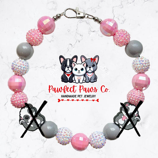 Love Stinks* Gray, White & Pink Sparkle Valentines Day Skunks Custom Beaded Dog/Cat Necklace!