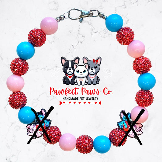 Ohana* Blue, Pink & Red Sparkle Valentines Day Stitch Custom Beaded Dog/Cat Necklace!