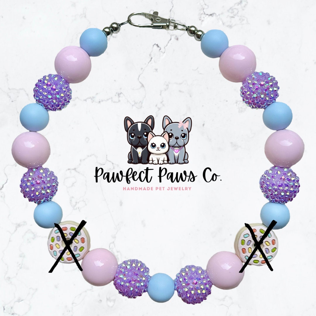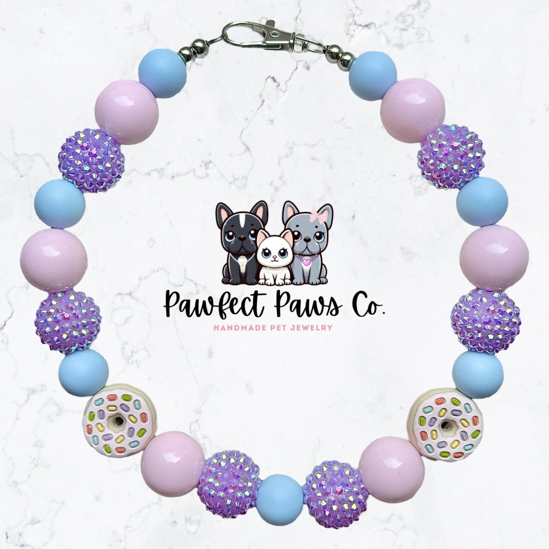 ¡Collar para perro o gato con cuentas personalizado Funfetti* con diseño de donut brillante en color rosa pastel, azul y morado!