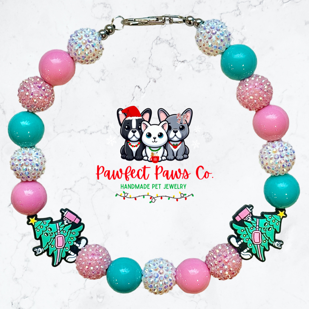 Holiday Sips* Teal, Pink & White Sparkle Christmas Tree Stanley Custom Beaded Dog/Cat Necklace