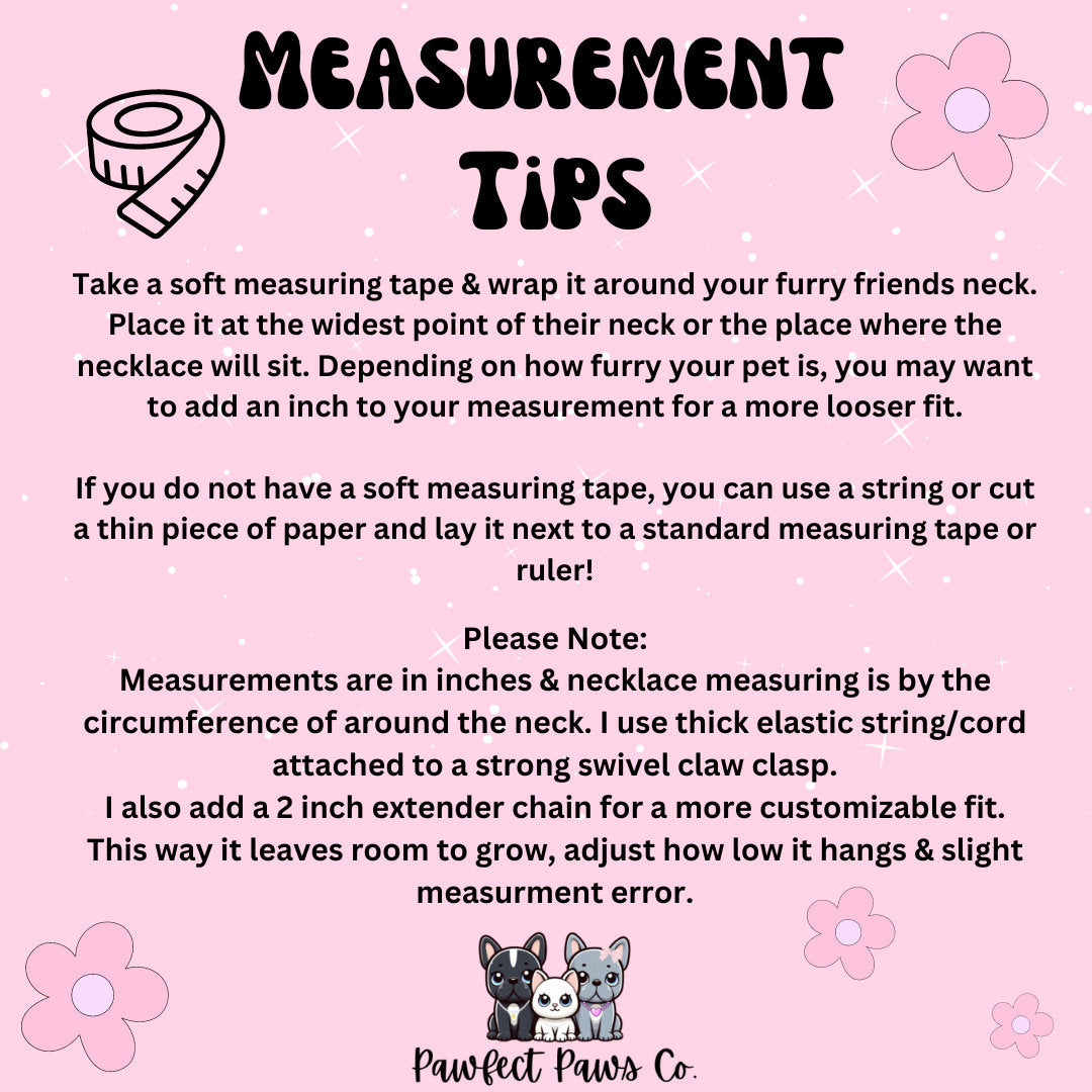With your dog in a standing position, use a soft measuring tape and measure around your furry friends neck. You don’t want it to be too tight so leave a little breathing room. For our furry friends with fluffy or thick fur, we suggest adding an inch or so to the measurement, so the necklace isn't too tight or get lost in their fur.
