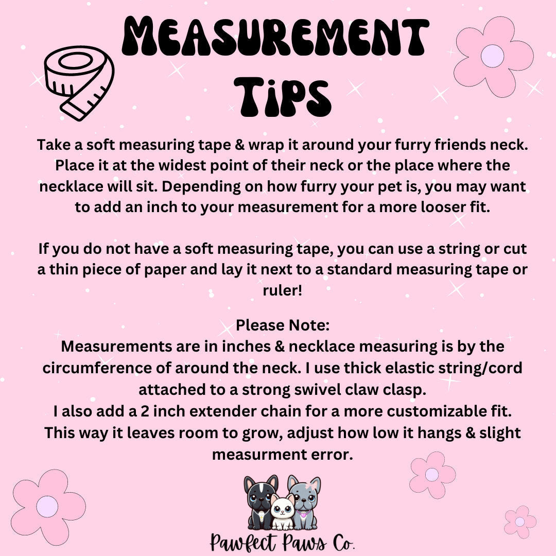 With your dog/cat in a standing position, use a soft measuring tape and measure around your furry friends neck. You don’t want it to be too tight so leave a little breathing room. For our furry friends with fluffy or thick fur, we suggest adding an inch or so to the measurement, so the necklace isn't too tight or get lost in their fur.