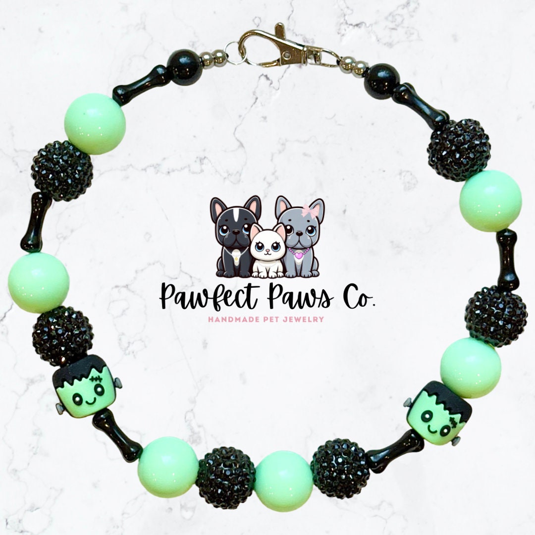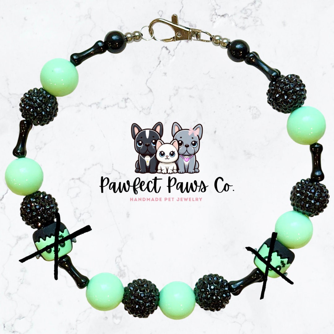 FrankenCutie* Green & Black Sparkle Frankenstein Bones Custom Beaded Dog/Cat Necklace!