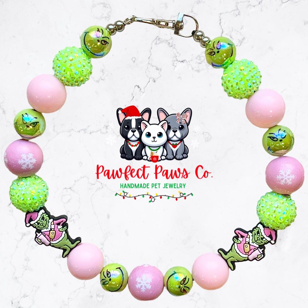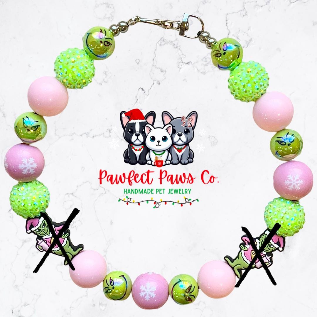 Girly Grinch* Green and Pink Sparkle Grinch Custom Beaded Dog/Cat Necklace!