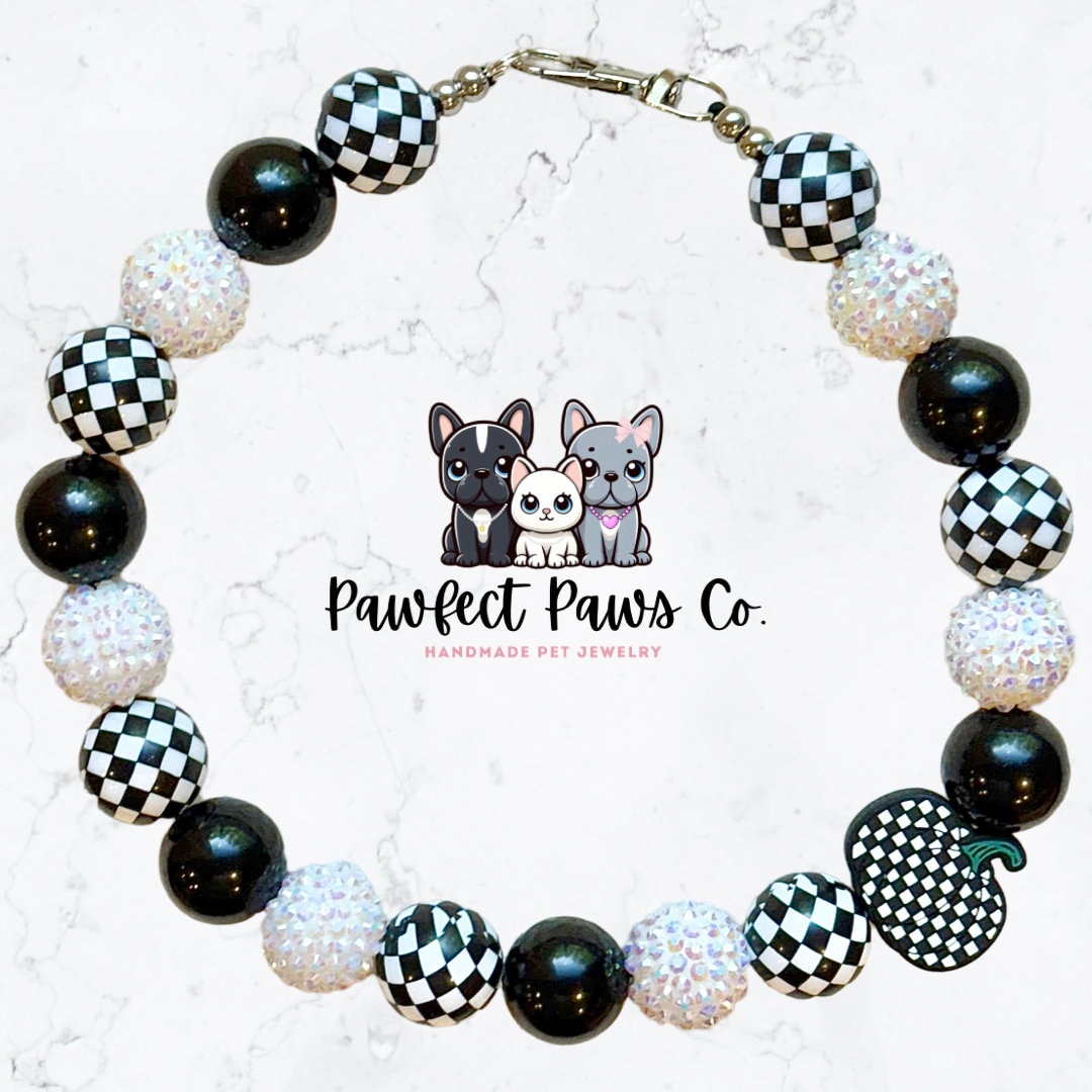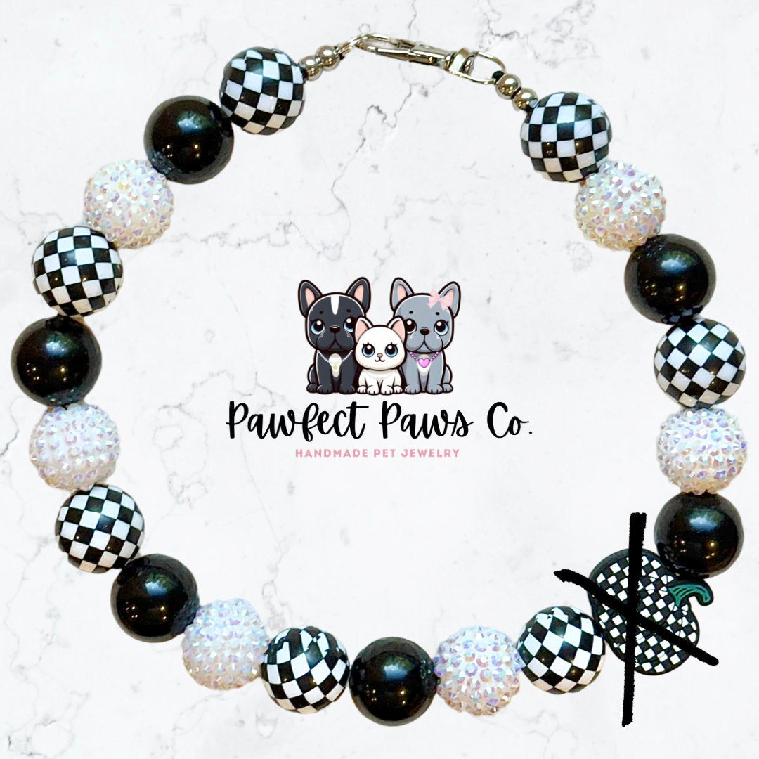 Pumpkin Check* Black & White Sparkle Checkered Custom Beaded Dog/Cat Necklace!