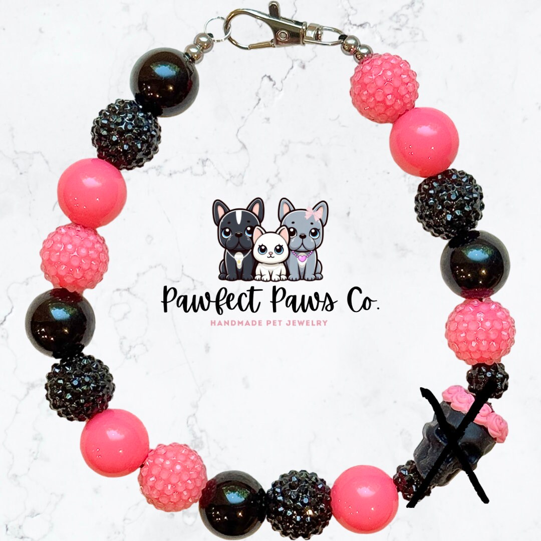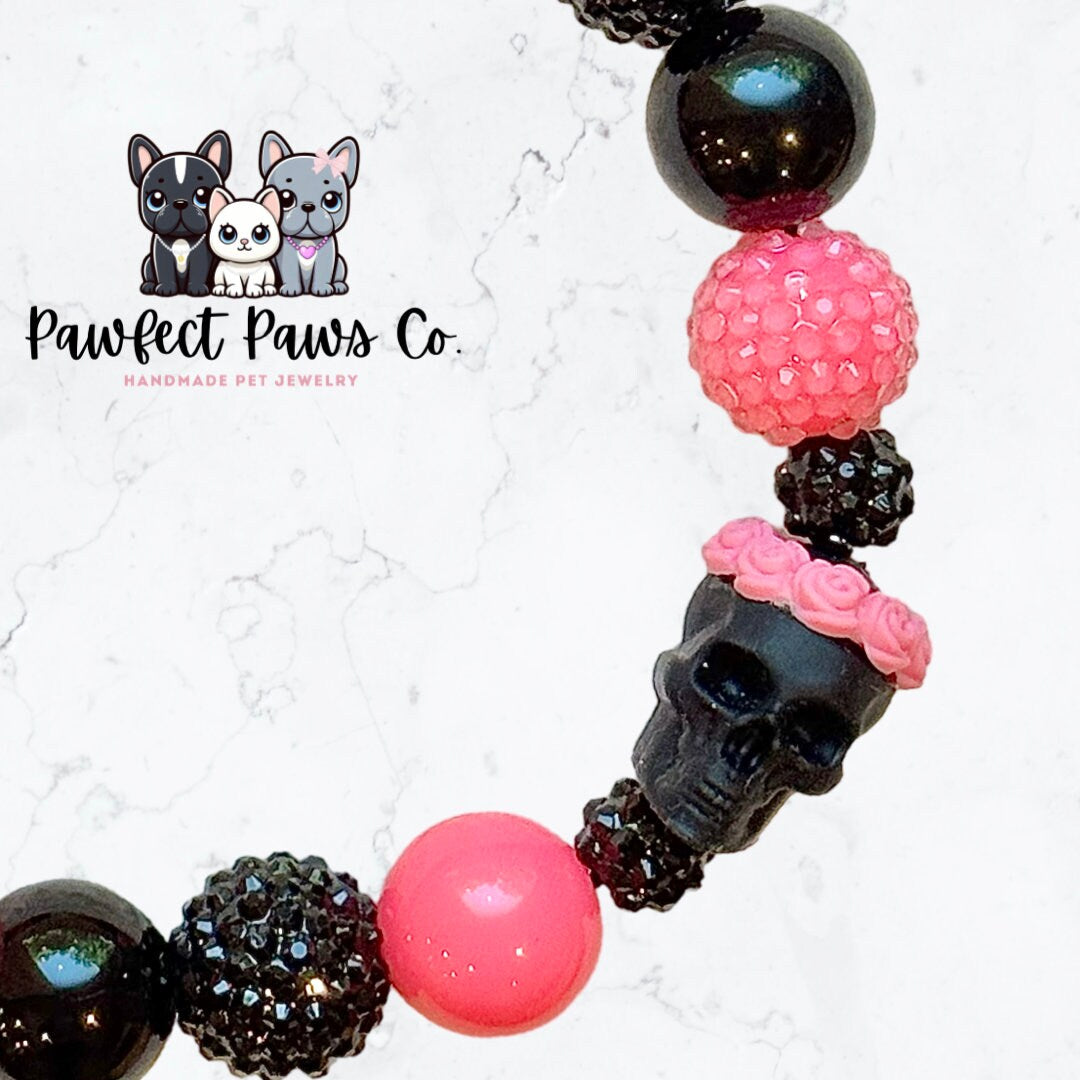 Gothic Bloom * Pink Black Sparkle Skull Custom Beaded Dog/Cat Collar Necklace!